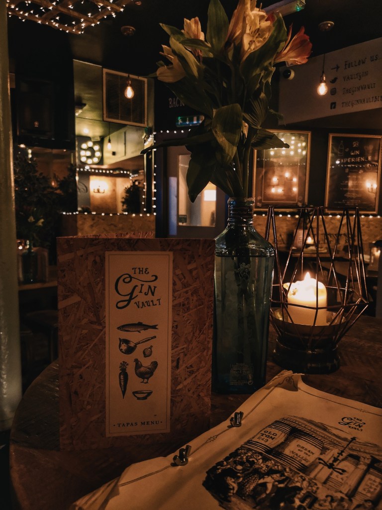 Entering the vault, it is a reasonable sized venue all lit up with fairy lights. Very pretty venue and very warming, the staff are there to greet you and make you feel welcomed, straight away I felt very comfortable in there. For some reason, it was giving me old London/Pirates vibes, something different and it’s something that draws you in and makes you sit your butt down! Now, where do I begin with the 40 pages worth of gin?! I mean, this is a gin bar, what do you expect? It’s not a gin bar if there not offering a bloody book full of the stuff, its safe to say that you will never be stuck for choice here. I asked for advice from the lady at the bar, who was very happy to help, I opted for a raspberry fruity gin cocktail that was refreshing and not too heavy.