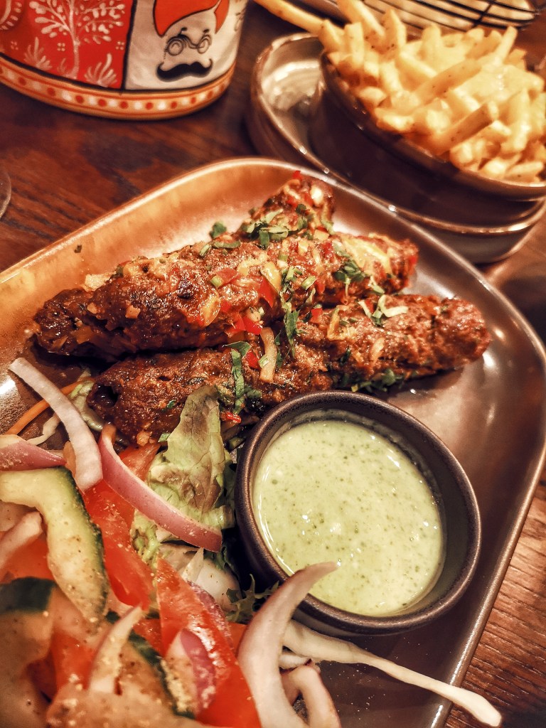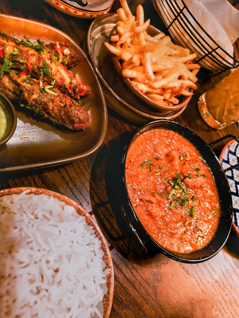 A wide variety of options from Currys, Tikka dishes, to Paaji burgers. A huge selection which will put a few people in a pickle choosing, I changed my mind literally 4 times. I found my myself scooping up my saliva looking at the menu, this food is defiantly going to test the tastebuds. First things first, Papadums. Papadams are served with mango chutney, pickle, onion relish and mint sauce they came with Far Fars which are like little crisps that have been deep-fried, very addictive! Looking at the drinks menu there is a variety of drink options, the cocktails I will say are quite adventurous! Bollywood star dirty martini to Gingerbread martinis packed with a punch, very exotic and appetising cocktails. I went for a classic Strawberry daiquiri and boy, did it pack a punch, very sweet and quite the naughty little cocktail packed with a strong KAPOW of Rum! After a 10 minute debate with myself on what the heck I should order, I decided to order the lamb gilafi Kebab with cheesy masala fries and Bhatura bread, We also ordered The chefs special chicken taka tak curry with fried rice.