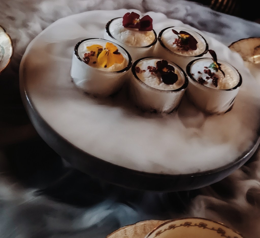 The time had arrived, and we were brought out menus and asked what afternoon tea we wanted to have. We all opted for the Juliet sparking rose afternoon tea which also came with a hot drink that priced at £35.00. The rose was served first, sweet and bubbly nothing to complain about at all, it was a nice refresher to start us all off. Of course, the famous dry ice spectacular experience was next displaying a couple of cheesecake puddings to ease us in before the main event. A showstopper, of course, you can see all heads turning to your table and all phones leap out of everyone’s pockets to film because it is quite simply, dazzling to watch. The cheesecakes were a nice touch, not too sweet but very favourable and was a nice touch.