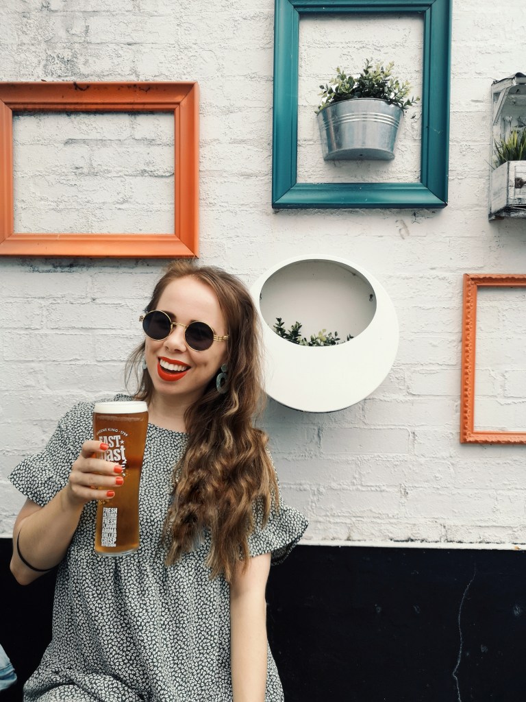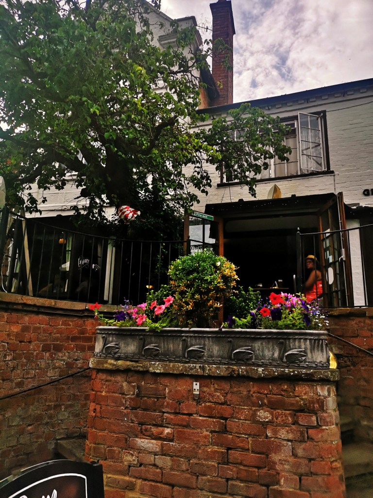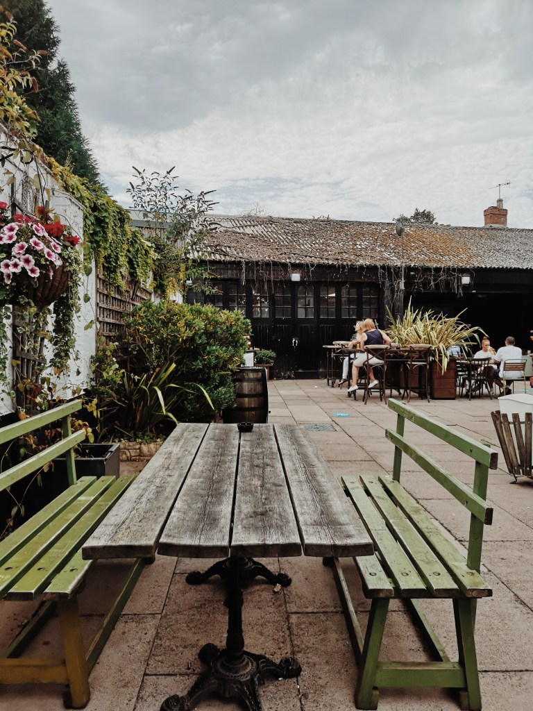 We next went for a little walk around the Town, down some quiet streets full of pretty doors that you would see plastered all over Instagram and Pinterest. The weather was so hot, literally was gasping for a drink every five minutes so we thought…BEER. We headed to The Rose & Crown pub (Part of Greene King pubs) which is a lovely traditional pub with quite the quirky outdoor seating area with a cool-ass barn in the back. very spacious, great drink selection (especially Ales) and a relaxing atmosphere, no old rowdy men here. The pub also serves food which we didn’t order but looked great, its dog-friendly, Table service, and all CO-VID measures are in place, so I felt very safe in there. I went for quite the large Abbott Ale that went down a treat.