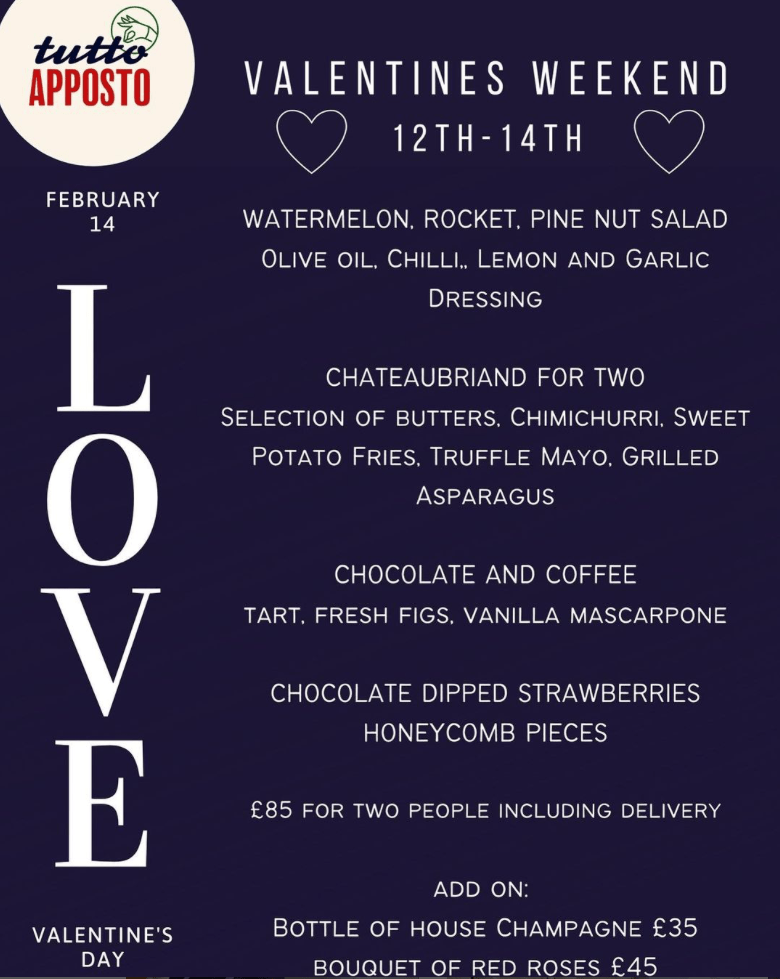Valentine’s day at home with Tutto Apposto – If you don’t fancy the overpriced steaks and the smoochy couples then what about a romantic meal at home? Step away from the Marks and Sparks meal deal, you deserve better and the Tutto Apposto dine at home Valentines meal is just what you deserve! The menu is quite delightful from Chocolate dipped strawberries that you can feed your partner or yourself to a Chateaubriand for two that can be shared by you and YOU! Price at £85 for 2, Its a steal!