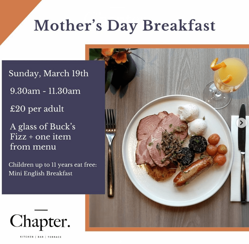 Enjoy Mothers day at Chapter in Edgbaston, indulge in a lovely breakfast just £20 pp and you will tuck into dishes such as their homemade brisket skillet or their full English breakfast – Brunch is an absolute must here! You will also recieved a glass of bucks fizz.
