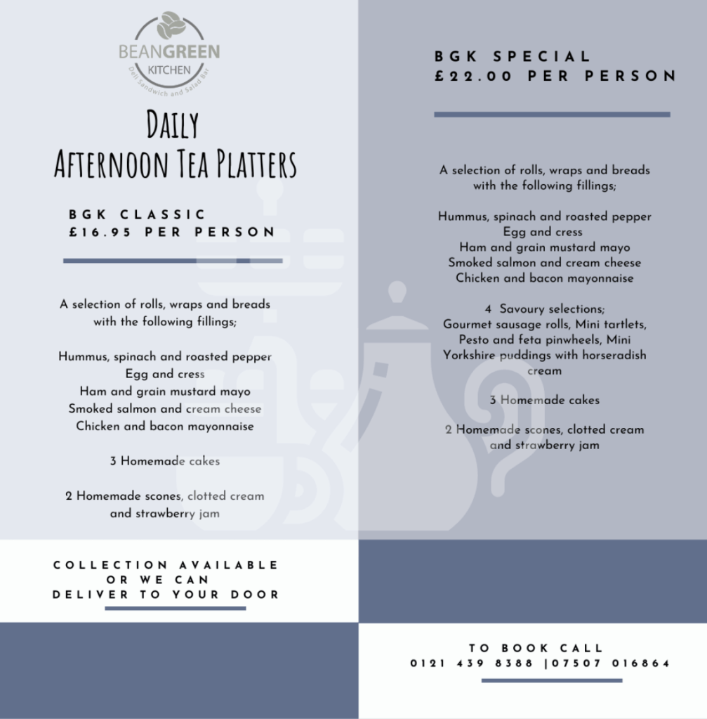 Bean Green Kitchen in Mere Green are delivering a delicious afternoon tea that is available for collection. From satisfying savouries to super sweet treats, Bean Green have put on a pretty fab afternoon tea from £16.95 pp, BARGAIN!