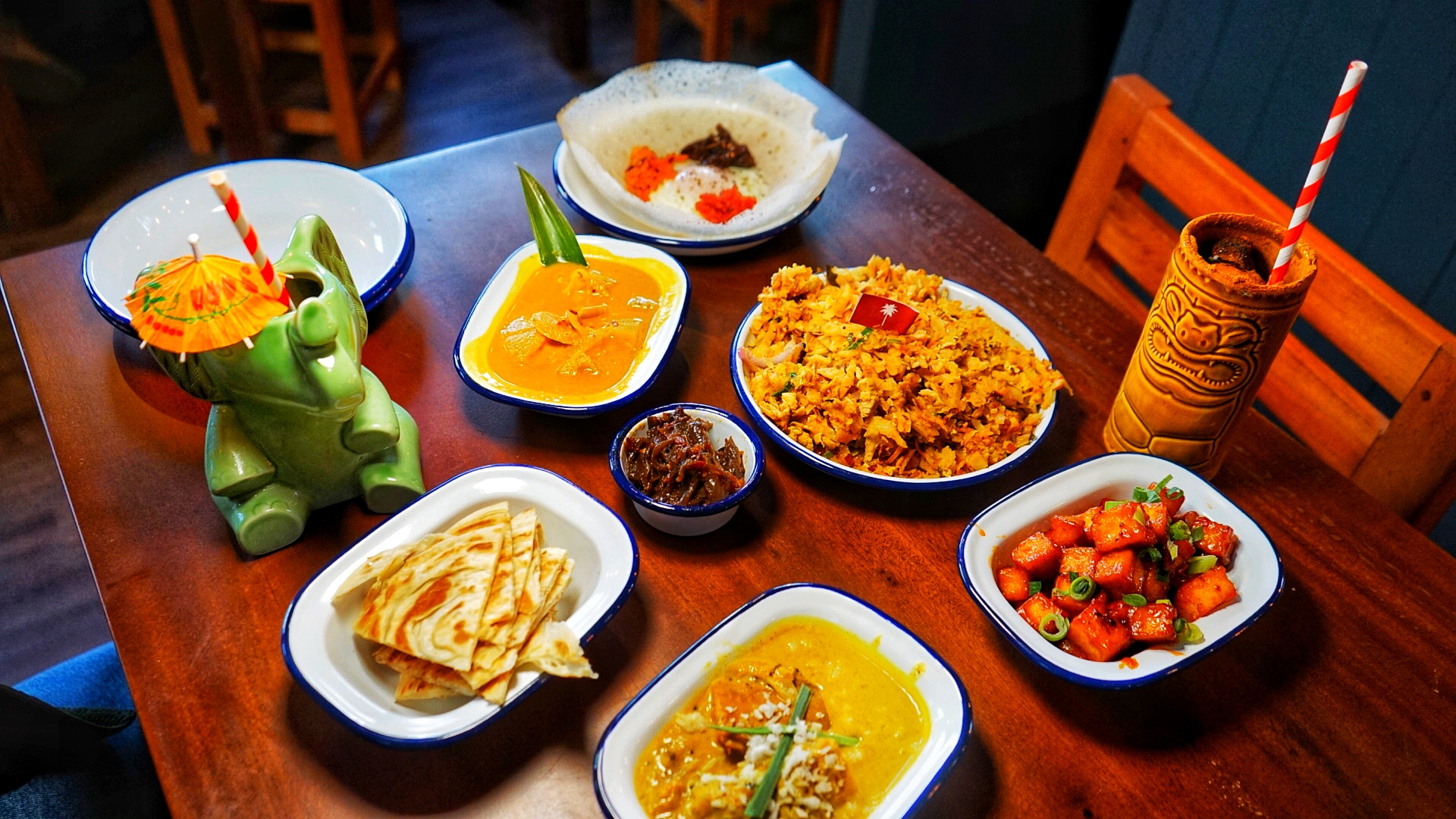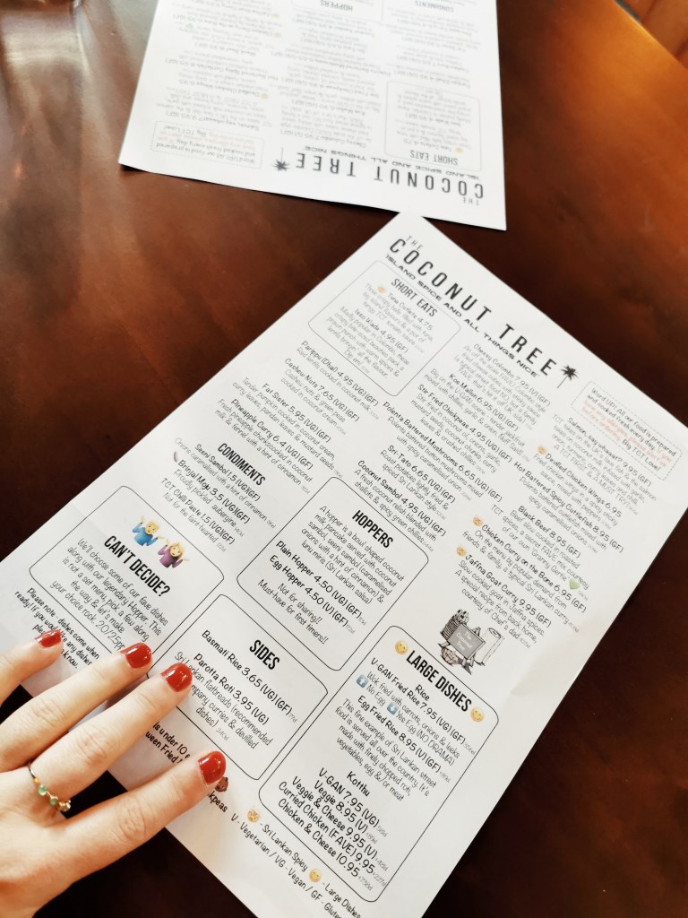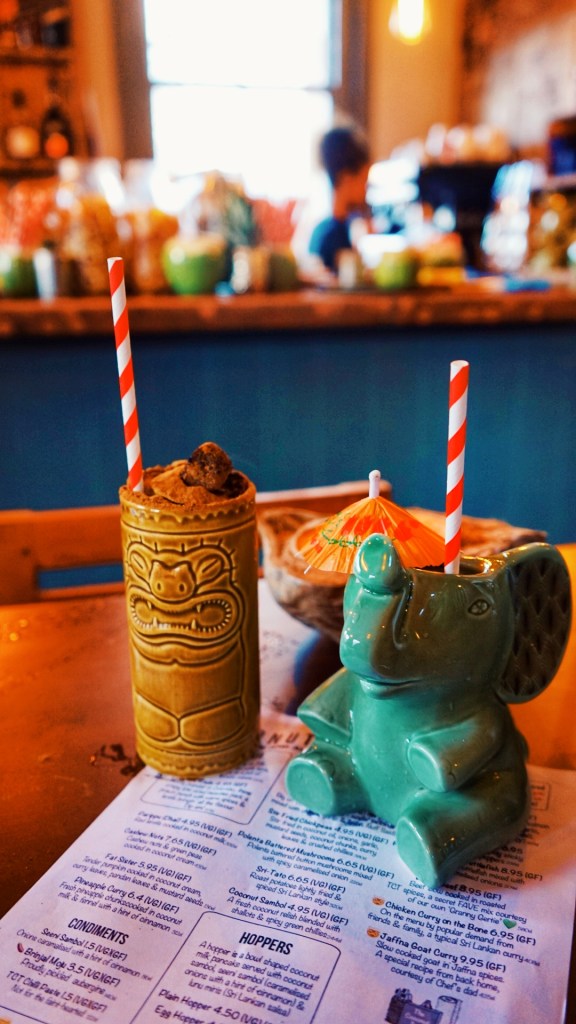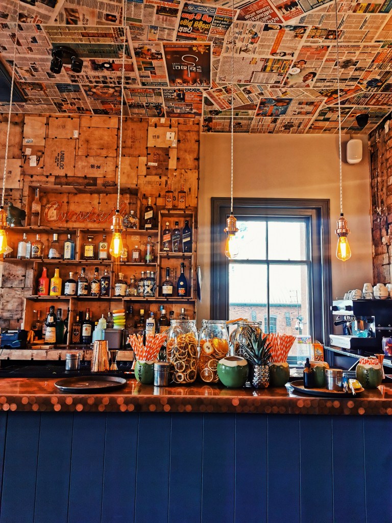 You’ll find the Coconut Tree sitting comfy in a two storey building on Gas Street. As I walk up the stairs, I’m hit with Island vibes and splashes of rustic Birmingham charm featuring some enjoyable graffiti pieces. James and I sat opposite a vibrant bartender who really contributed to our Sri Lankan experience. The Coconut Tree is made up of small/large tapas-style Sri Lankan dishes with vegan and veggie options a plenty, but first… cocotails!