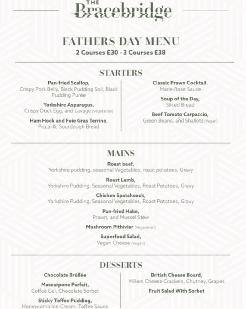 Spend Fathers day at The Bracebridge in Sutton Park, enjoy two courses for £30 or three courses for £38.
