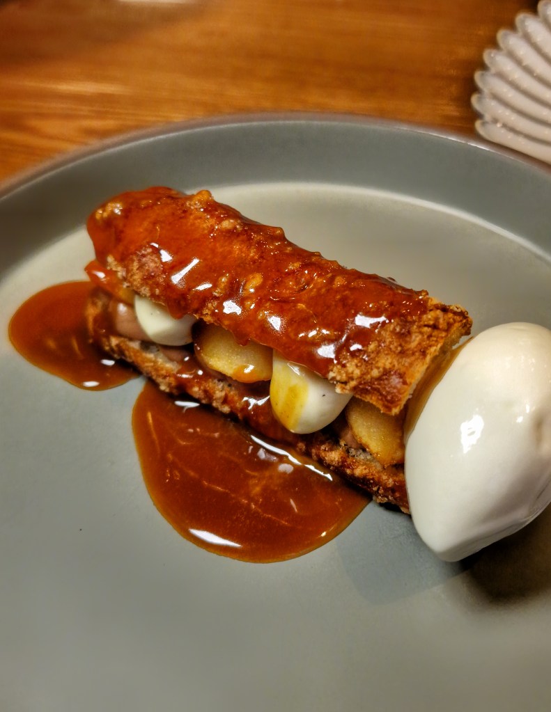 Another lovely surprise was that Tom delivered our next course, the eclair, and added an extra dessert for us to try which was the Araguani chocolate sweet dessert. Araguani chocolate, crème fraiche, pecan, caramel and sherry filling was utterly gorgeous, loved the hidden surprise in the middle! The éclair was filled with pink lady apples, covered in a rich butterscotch sauce and served alongside buttermilk ice cream, it was delightful and such a wonderful dish to end a perfect meal.