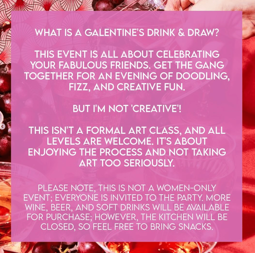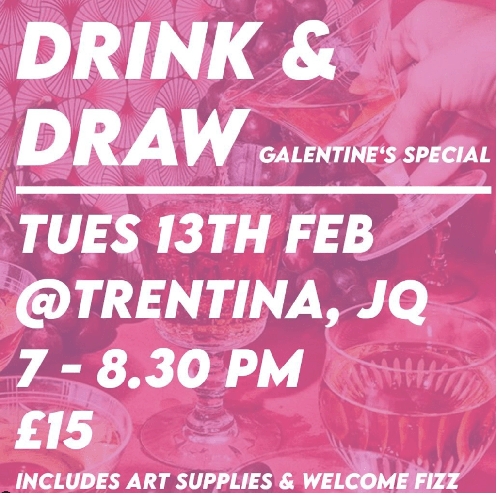 Join Trentina for a Valentine’s Drink & Draw event! Gather your friends for an evening of camaraderie, wine, and creative fun at Trentina JQ on Tuesday 13th February from 7pm to 8:30pm. Tickets are £15 and includes a welcome glass of fizz, all necessary art supplies, and a mix of guided drawing and a themed creative brief. While additional drinks will be available for purchase, the kitchen is closed, so feel free to bring your favourite snacks. This inclusive event is not just for the ladies – everyone is welcome to join in celebrating the joy of friendship!