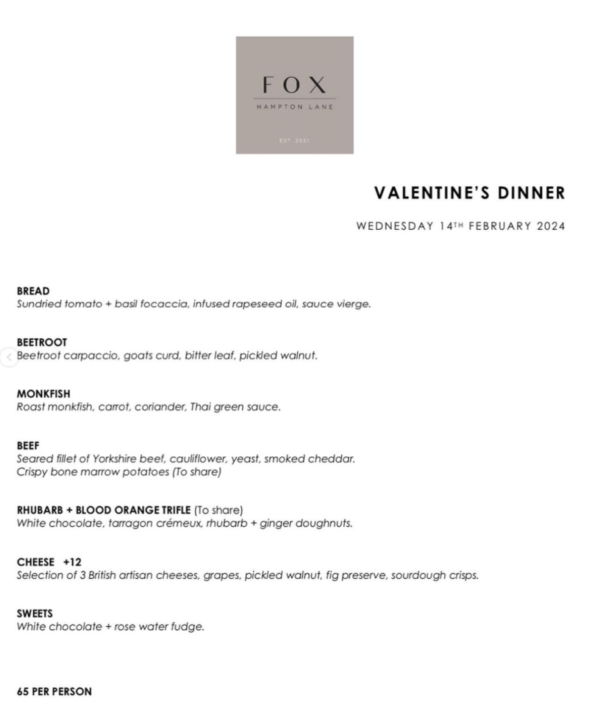 Indulge in a romantic Valentine’s celebration at Fox Hampton Lane! Enjoy their delightful lunch experience from 12pm to 2pm, featuring their normal à la carte menu or for an enchanting evening. From 6pm to 8:30pm, enjoy a tantalising 5-course menu at £65 per person. With limited availability, reservations are now open.