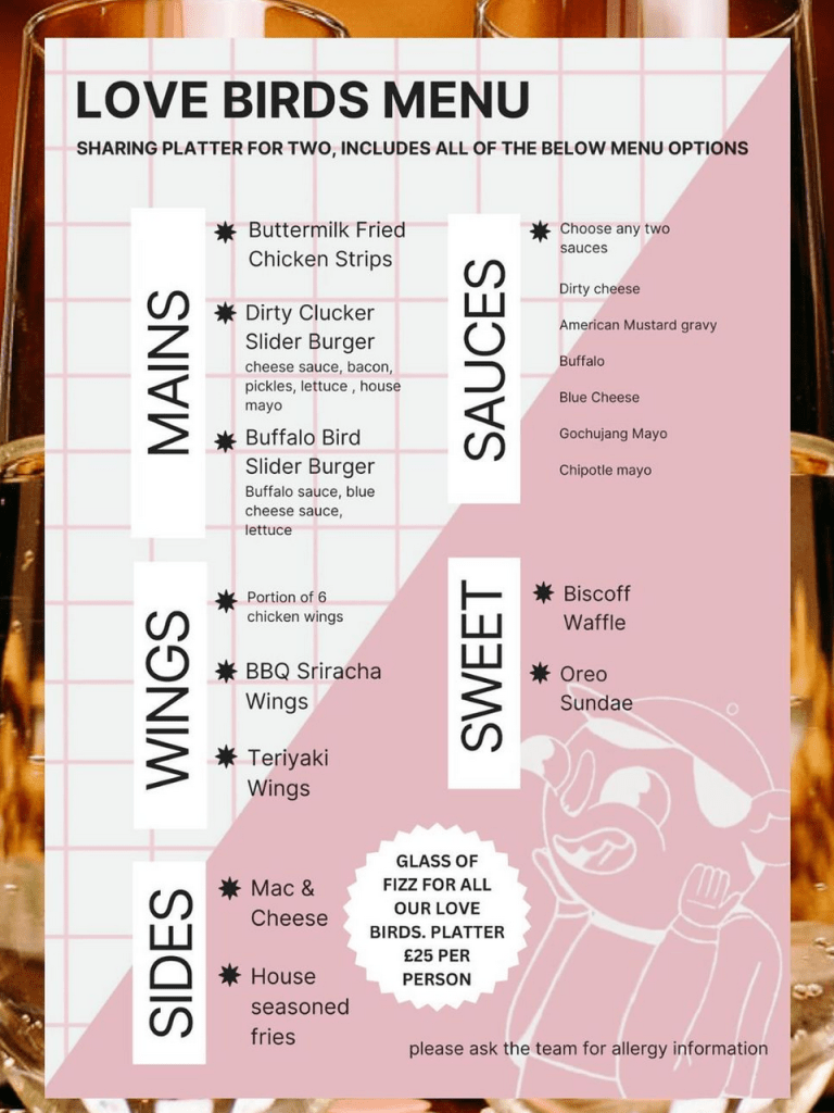 Attention all Love Birds! This Valentine’s Day, head to Yardbirds for a special celebration. For one night only on the 14th of February, indulge in their Love Birds menu designed for two, featuring the perfect fried chicken share platter. Priced at £25 per person, savour the flavours of their delectable platter and enjoy a complimentary glass of bubbles to make your Valentine’s dinner truly special.