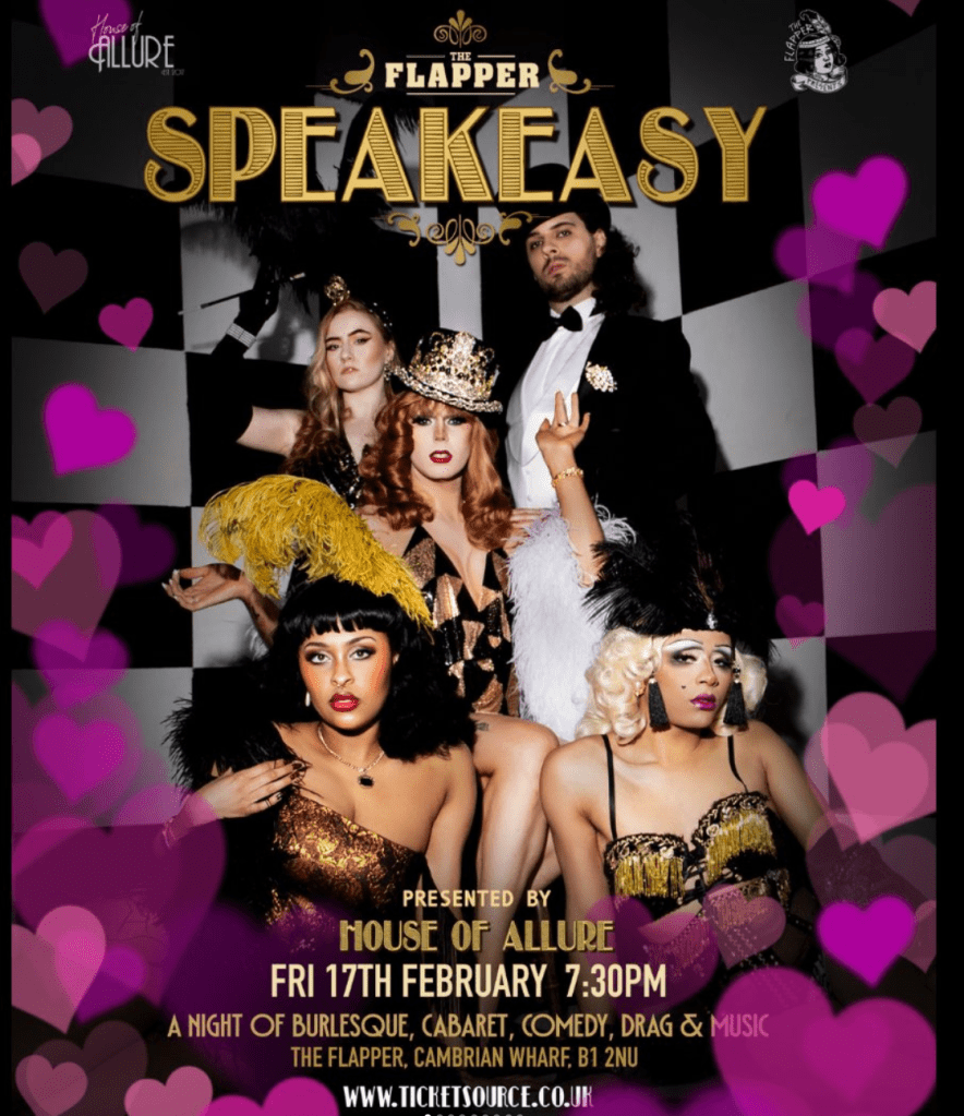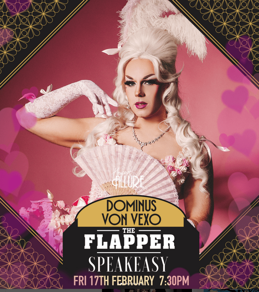 Announcing ‘The Flapper Speakeasy Valentines Edition’ brought to you by The Flapper and Dominus Von Vexo of House Of Allure! This show promises to tantalise and entertain, featuring a stellar cast bringing decadence, glamour, comedy, games, and lovin’ fun to your Valentine’s celebration. Hurry and secure your tickets fast, as the last event was a big 𝐒𝐄𝐋𝐋 𝐎𝐔𝐓!!! Don’t miss the Valentine’s chaos – the show kicks off at 7:30 PM. Get ready for an unforgettable evening of entertainment and celebration!