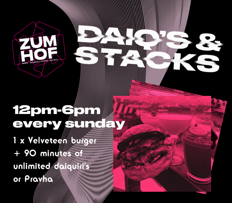 Zumhof are offering a great bottomless brunch if you love daiquiri’s and burgers. On Sundays from 12 to 6pm you will received unlimited daiquiri’s and velveteen burgers – Daiquiri flavours include frozen bubblegum, strawberry and Pineapple. Velveteen burgers are Zumhofs very own burgers that include flavours such as kimchi som loving’ and squeaky cheese.