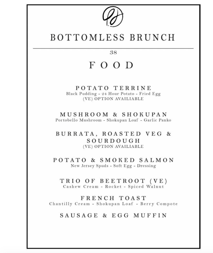 Choose from two options: The two course bottomless brunch served with unlimited Prosecco, Pornstar Martini, Lychee Martini, Mocktails (£45) or two course bottomless brunch served with the unlimited drinks in option two and unlimited Champagne and Rosé Prosecco (+£9.95)
