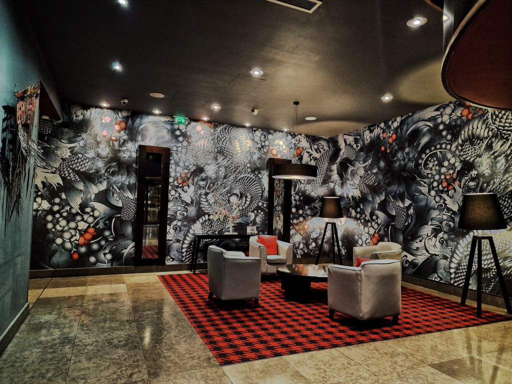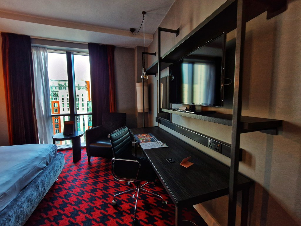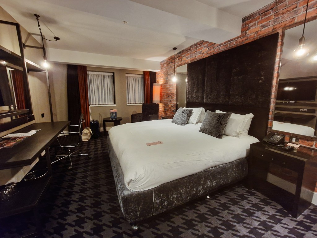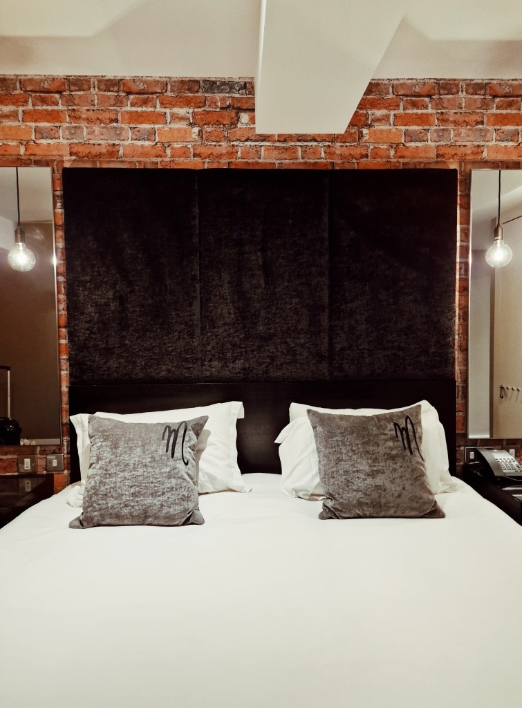 Just a five-minute walk from the train station, you will find Malmaison tucked under the luxury shopping district “The Mailbox”. Hotel guests will first be greeted by a Starbucks on the side of the hotel, in which guests coming by train may be happy to see after a long train journey. The entrance is big, and the reception is just after the Starbucks on the left, checking in was easy and took five minutes. Staff are polite and friendly, and if you are new to the City they are ready with plenty of recommendations to make your visit to Birmingham a jam-packed one! There is lift access and by following the directions, it was pretty easy to find our room. Sleek throughout, it kind of gave me boujee Batman/Gotham vibes which I am all for!