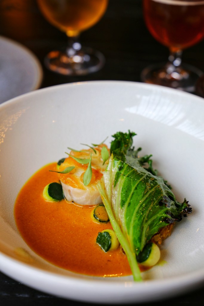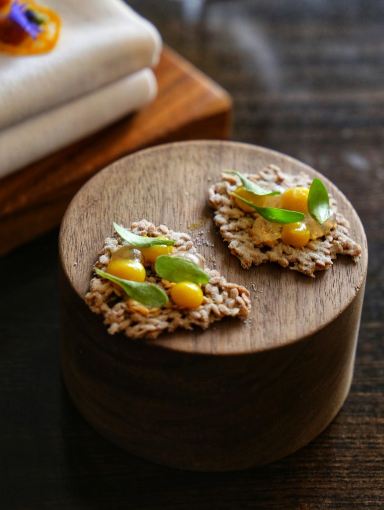 Upon arriving at the restaurant, we were warmly greeted by the host, who opened the grand stained doors reminiscent of a scene from ‘The Wizard of Oz.’ The lounge was luxurious and sleek throughout, and the service was impressively sharp. Within moments, we were served a sharp, zesty, and gingery palate cleanser, along with mouth-watering snacks such as Linseed Crackers with Mustard and Yoghurt and Mango Tuille with Chutney, Burnt Lettuce and Raw Mango. I paired the snacks up with Empress Ale IPA. We were there to sample the beer, which I felt matched well with many of the dishes. All snacks disappeared within one mouthful, leaving us eagerly anticipating the upcoming culinary journey. After 45 minutes of snacks and drinking beer, we were escorted up to the restaurant for…more snacks.