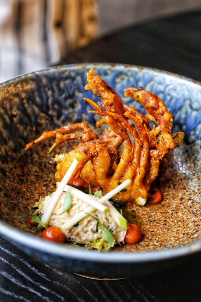 Starters arrived, and we tucked into the unforgettable Aloo Tuk – Achaari potatoes and tamarind, along with the Kekda Kerala, a soft-shell crab with caraway seed tempura and crab shaami (the winning course on Great British Menu). The Aloo Tuk left us speechless; no words can sum up how beautiful that dish is, while we tucked into the soft-shell crab dish, it became evident why it was the winning course. The attention to detail, the creative use of ingredients, and the seamless fusion of traditional Indian elements with contemporary techniques elevated this dish to a level of culinary brilliance.