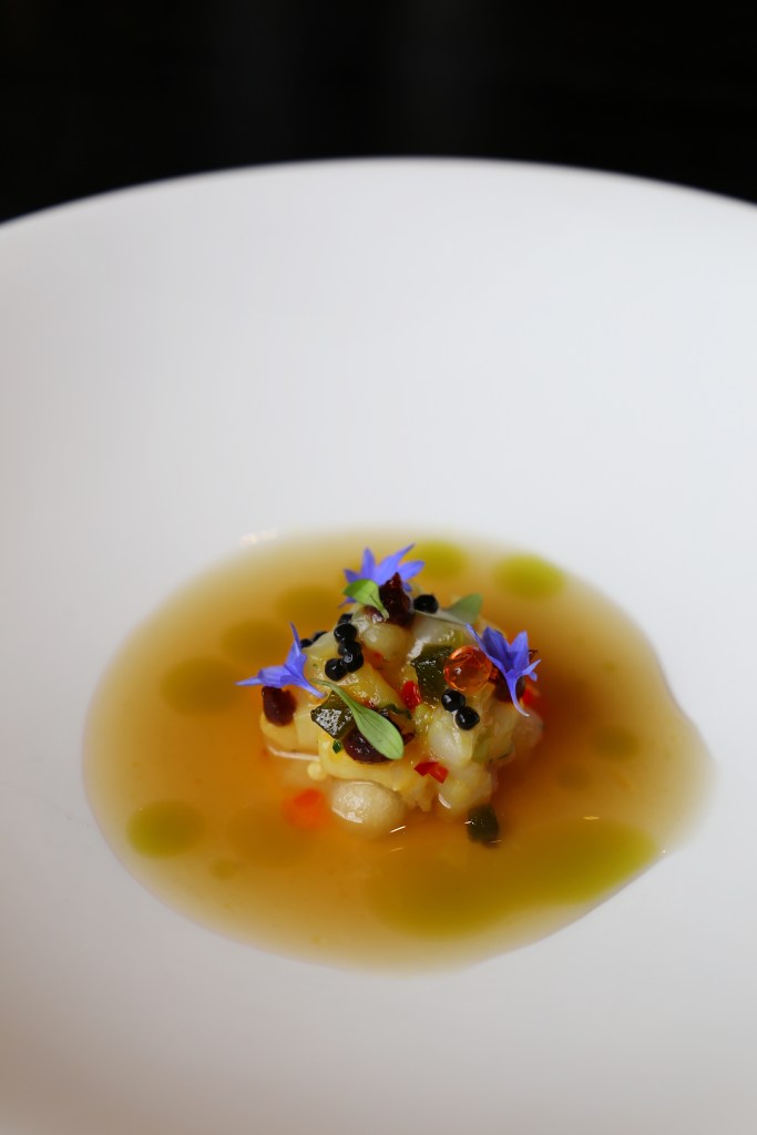 Opheem’s dining room is a stunning sight with its sleek design and open kitchen layout that allows diners to witness the chefs’ do their thing. Again, service was sharp with drinks orders, and within five minutes, what I thought was our lunch set menu was indeed another snack: BHUTTA – Mumbai, which was grilled corn with spiced butter and corn sorbet. The grilled corn was coated in a sublime spiced butter that was worth smudging my lipstick all over my chin. The corn sorbet, however, fell a bit flat; I could just taste coldness, no flavour. However, my partner enjoyed it; a snack that just isn’t for everyone but that was completely forgotten about when the bread course was served, which was beautiful. PAU is a Hokkaido milk loaf that came with a light spiced lamb pate that was just gorgeous, bread was soft, fluffy and dipped in the pate was just simply flawless.