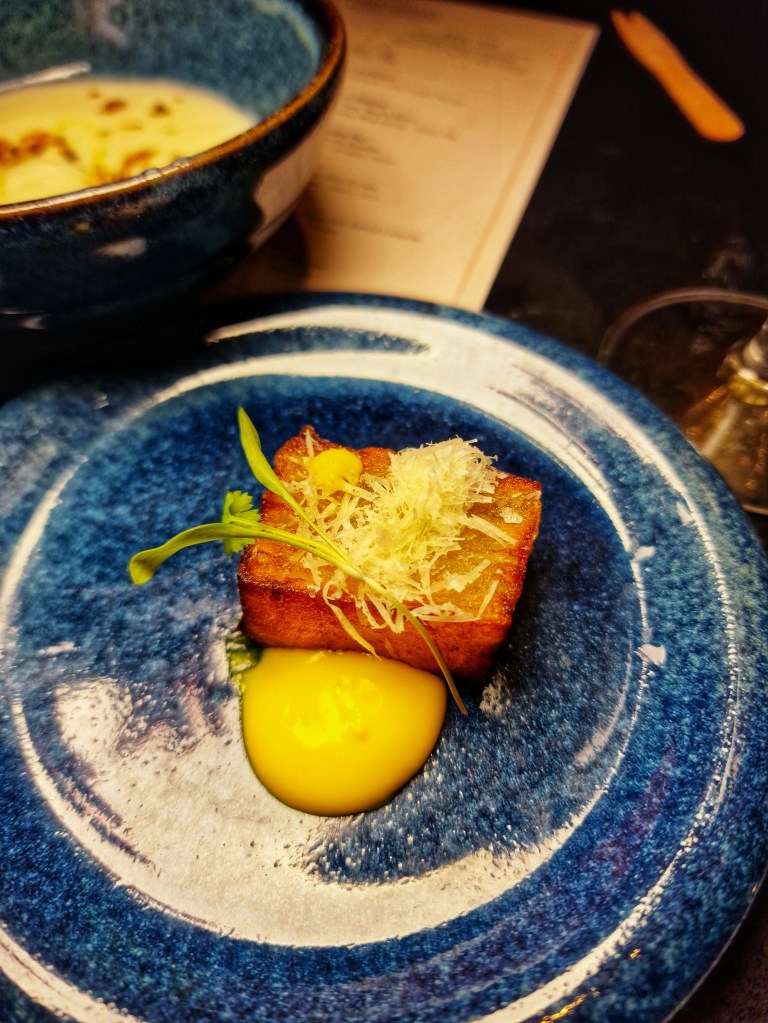 We start with course one: Chips & Cheese – Parmesan Espuma, Curry Oil & Emulsion, Crisp Potato Terrine – Holy CHIP! What an introduction to a six-course menu! The emulsion was absolutely sensational mixed with the terrine; I couldn’t help but lap it up – The waitress had to literally fight me to collect my bowl because I couldn’t stop fingering the sauce.