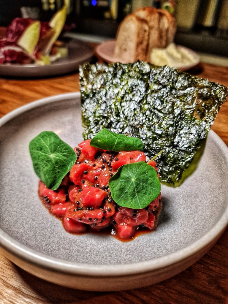 To begin, we were served sourdough bread with hay-smoked butter—an opulent and creamy delight. Perfectly baked, with its ideal thickness and soft, fluffy interior, it proved to be a versatile companion throughout our dining experience. That butter? Well, I could have had a tub of it and eaten it like ice cream. Next up was the Marinated Beef Tartare with rapeseed, smoked soy, and toasted nori. Scooped up in the nori sheets, creating the perfect little parcel, one mouthful, and BOOM! Incredible flavours of sweetness and smokiness came powering through. It was precisely in this moment I thought, ‘Holy Shit… I think I just found my new favourite restaurant.’ I had quite the Ratatouille moment until Emma blinded me with my selfie light.