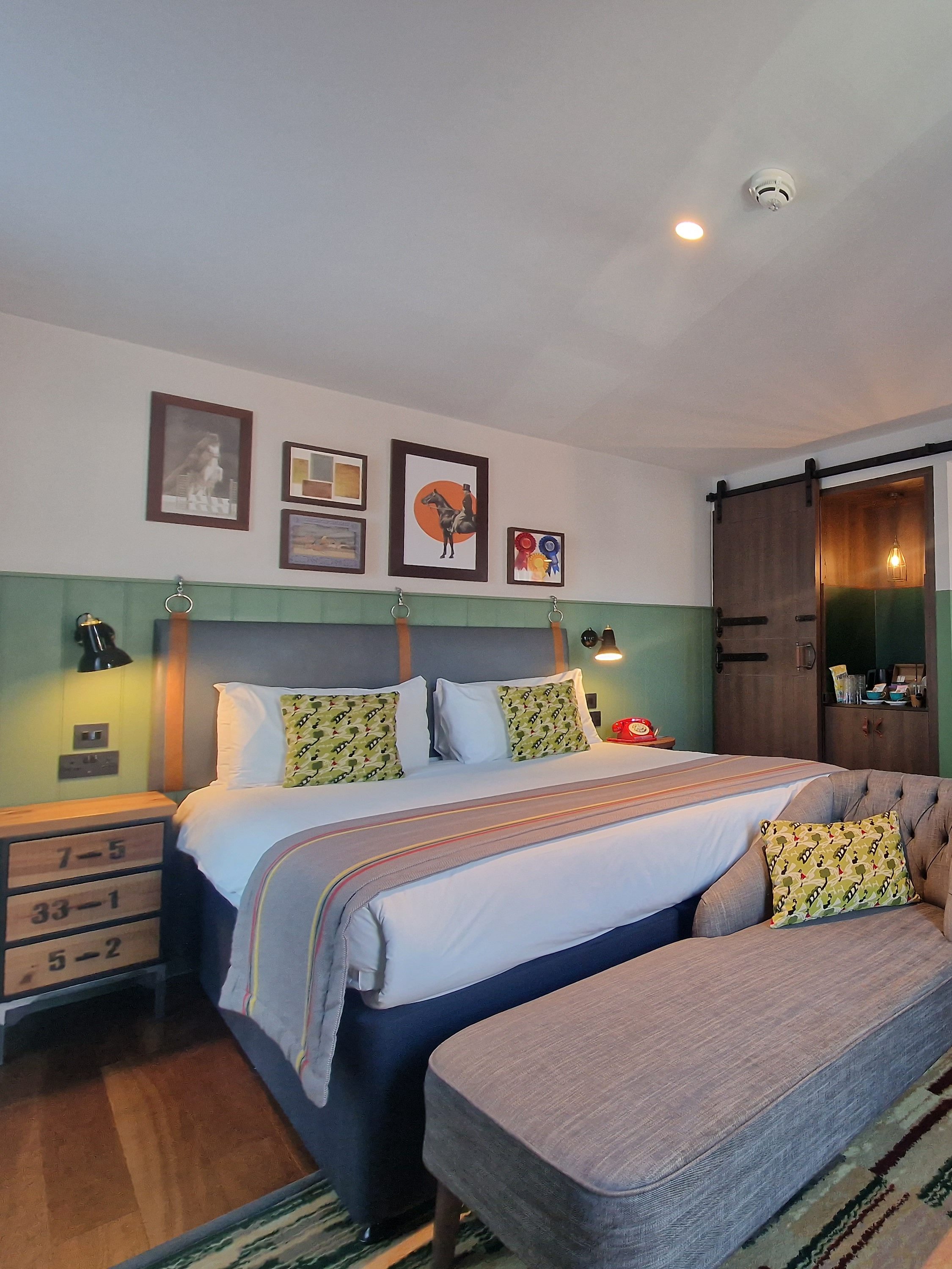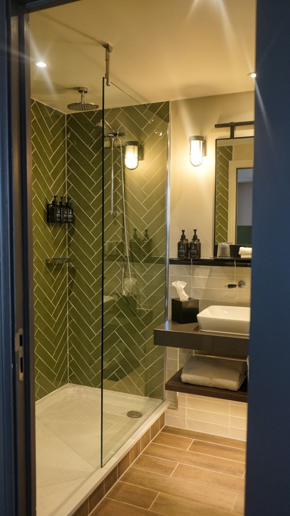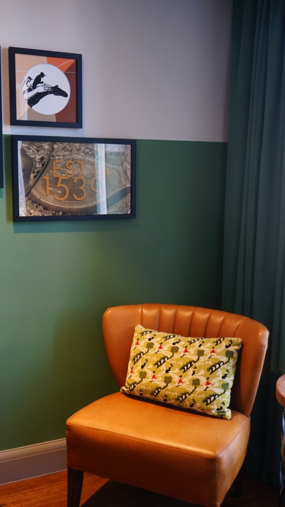 The bathroom was equally impressive, featuring a fantastic waterfall shower that my partner, being 6 ft 6, thoroughly enjoyed! With ample mirrors, easy-to-use air conditioning, and a Smart TV, the room exuded a beautifully decorated ambiance. Paying homage to the Chester Racecourse, the room’s décor added a charming touch of personality. We relaxed in the room before dinner, getting into our robes and listening to music on the TV before we started to get ready for our dinner downstairs.