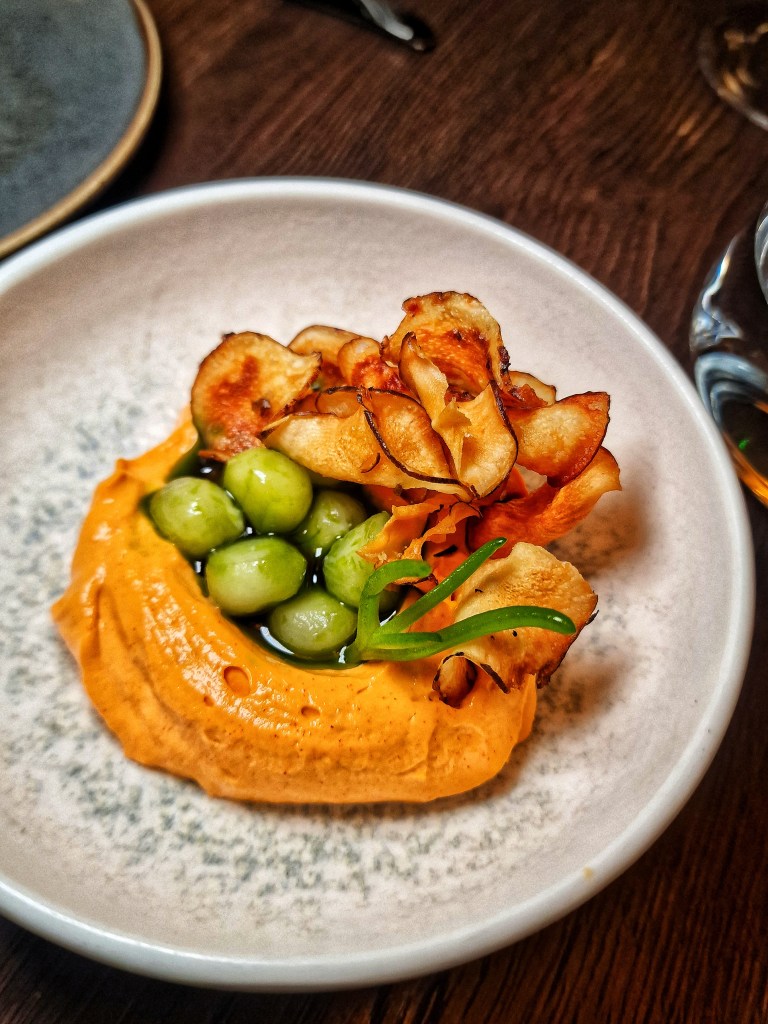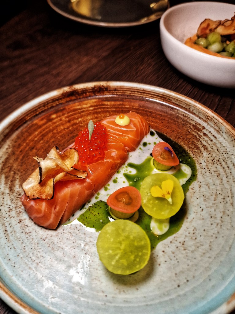 The restaurant started off quiet, gradually filling up as the evening progressed. We started of with a bottle of Pyros Appellation Malbec, which we found irresistible, especially paired with our mains. Fresh bread was put down on the table followed by our starters: Cured North Sea salmon with buttermilk, radish, wasabi, and artichoke, alongside haggis scotch eggs. Both dishes were delicious, especially the salmon offering a particularly fresh and well-seasoned flavour and was just a stunning dish.