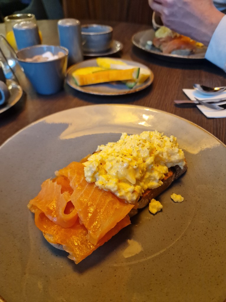 Breakfast was bustling, offering a variety of locally sourced fresh produce, a continental buffet, and classic à-la-carte options cooked to order by skilled breakfast chefs. The continental section featured cereals, fresh fruit, and pastry options, while hot dishes such as English breakfasts and salmon on toast were available via table service. Though our breakfast was included in the room rate, I noted that it would cost £15 if booked in advance or £20 if booked on the day and served in The Forge. Breakfast prices for children under 4 were complimentary, while those under 12 were £10. Given our slightly sore heads from the previous night’s indulgence, we opted for the continental breakfast and scrambled eggs on toast, which proved to be a light and flavourful choice, nice and easy on the stomachs! Tea and coffee were available aswell as fresh fruit juice that we enjoyed.