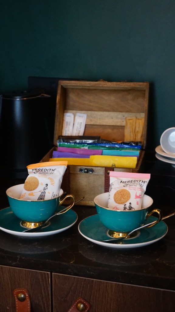 We were booked into a King Deluxe room, and as we entered, we were greeted by a long corridor leading to a spacious and luxurious room. It was bright and inviting, making us feel instantly at home. The room, located at the front of the hotel, remained serene despite occasional pedestrian and vehicular traffic. Furnished with a huge King-sized bed, a work station, a Nespresso coffee machine, fresh towels, toiletries, and plush dressing gowns, the room left no detail overlooked! The stocked fridge offered a selection of soft and alcoholic drinks. I particularly appreciated the art deco cups and saucers, perfect for enjoying numerous cups of tea!