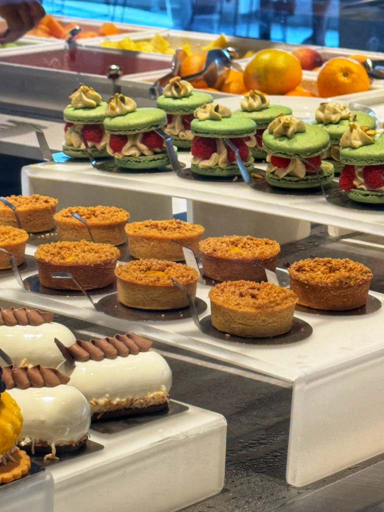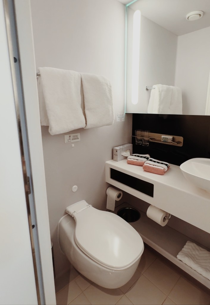 As we wandered around the ship, we were in awe of its sheer size. We found our floor and accessed it via one of the many elevators (the ship is very accessible with plenty of elevators and stairs). When we opened the door to our Sea Terrace room, we were greeted with a spotless space complete with a balcony and a cosy hammock. Everything was neatly arranged—towels, information booklets, mini fridge, fresh water, and a tablet to control the room’s lights, blinds, TV, and more. There was ample storage for our clothes and toiletries, making the room very comfortable for two people. The bathroom was compact, as you’d expect on a cruise, but it was functional and well-designed for our needs. The balcony quickly became our favourite spot, where we enjoyed many sunsets and breakfasts.