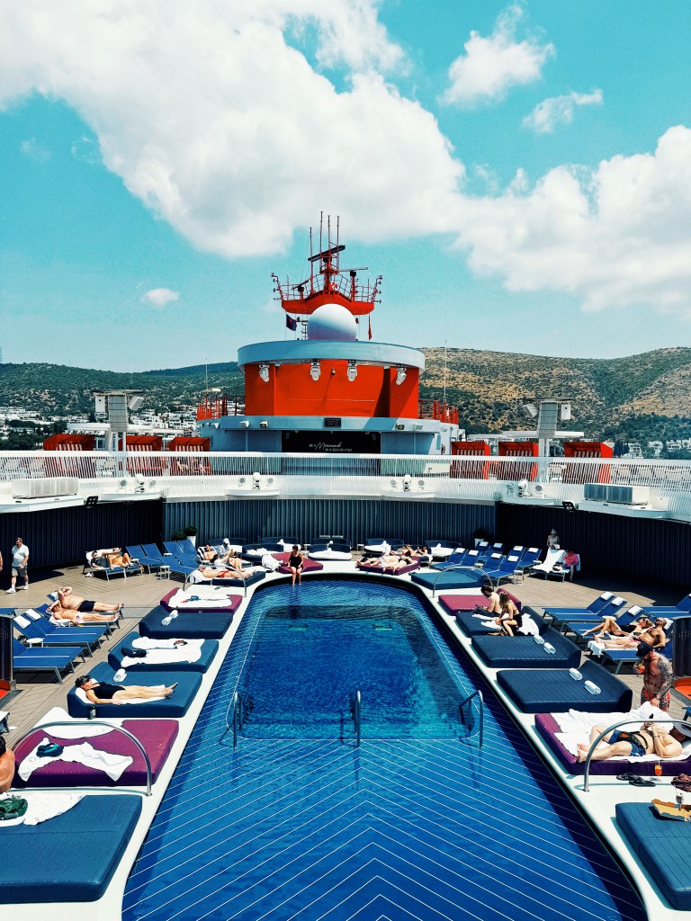 Checking in was a breeze. We had selected our check-in time before arriving in Athens, and when we got there, there were no queues in sight. We received wristbands that acted as our identity cards and payment method, making it super easy to check in and out of the cruise and pay for drinks. The staff welcomed us with warm smiles, and our bags were already in our room by the time we got there—now that’s first-class service! Although we only caught the tail end of the arrival party, I recommend heading straight to the top deck when you board to join the fun and grab a glass of bubbly.