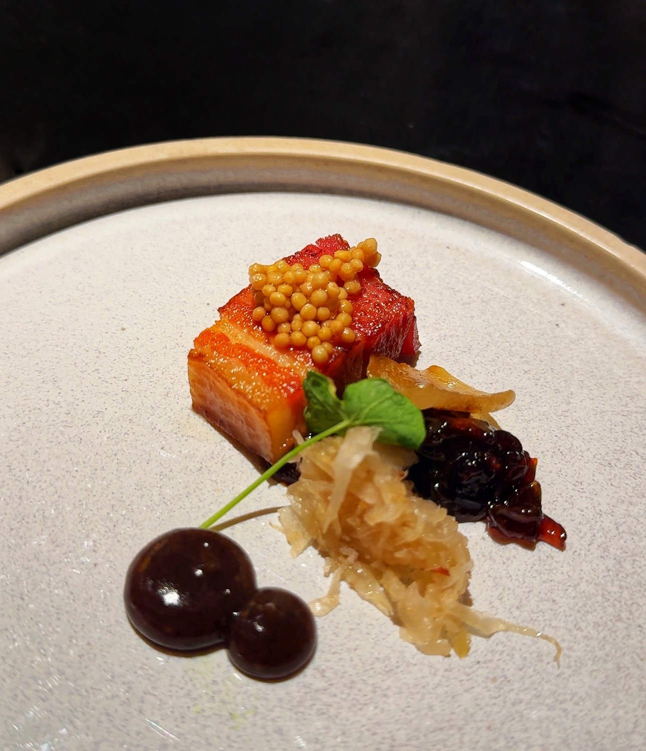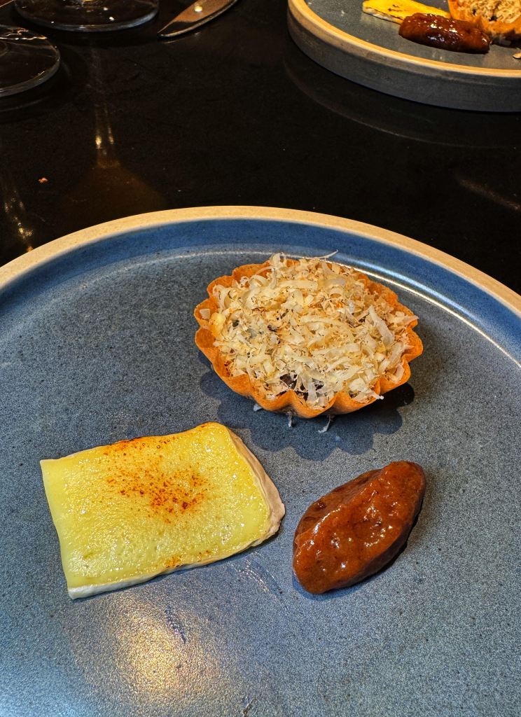 The next course, Brussel Sprouts (Barbecue Hispi Cabbage with Aged Ewe’s Cheese and Black Garlic Emulsion), was a bit of a mess. The emulsion was way too tangy, completely overpowering everything else on the plate. I’m not a brussel sprout fan, but even if I were, I doubt I’d have enjoyed this. Don’t get me started on the Presentation, it was non-existent.