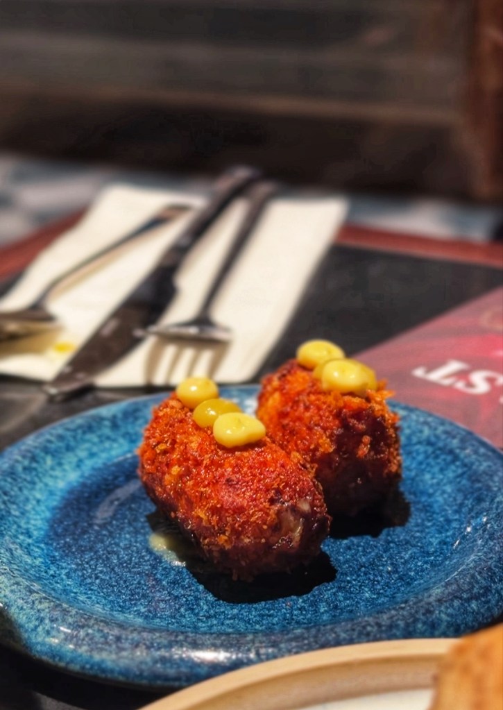 We ordered a couple of snacks to begin with: Smoked Ham & Cheddar Croquettes and Warm Sourdough (£10 for two). The croquettes were tasty with a nice sweet topping of gherkin, but the sourdough was just sourdough—nothing special, served with chicken parfait butter that, honestly, tasted like plain Flora.