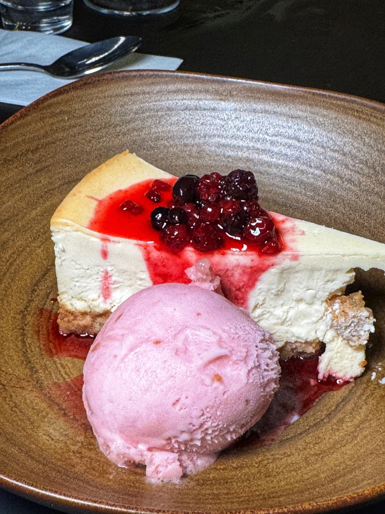 Despite being full, we couldn’t resist dessert, sharing a Baked Vanilla Cheesecake (£8.00) with raspberry sorbet and berry compote – a sweet, fluffy, and delicate end to our meal. After dinner, we enjoyed a couple of cocktails in the lounge before heading back to our room for a peaceful night’s sleep.
